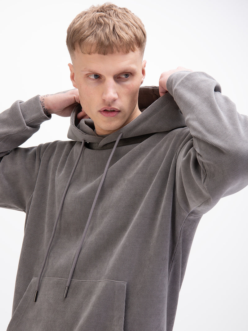 Men's relaxed-fit grey hoodie with front pocket and drawstring hood, front view Men's relaxed-fit grey hoodie with front pocket and drawstring hood. Men's relaxed-fit grey hoodie with front pocket and drawstring hood, front view
